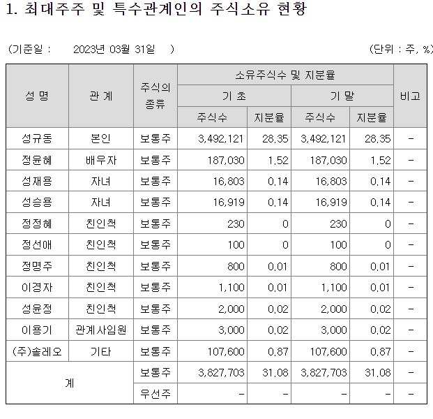 이오테크닉스는 성규동 대표이사가 28%를 보유하고 있고 특수관계인을 합치면 총 31%의 지분율로 안정적인 지분율을 보유하고 있다.