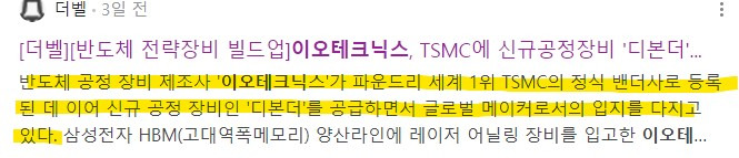 이렇게 된 이유는 시장에 이오테크닉스가 가진 HBM 향 모멘텀과 대만 T사 향 납품 가능성이 조금씩 조명되었기 때문이다.