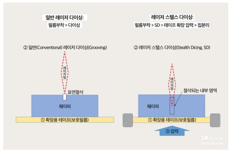 웨이퍼 내부를 레이저로 먼저 절삭한 후에 미리 붙여둔 테이프에 힘을 가하면 알아서 칩이 분리가 되는 기술이다. 이 방식은 레이저로 직접 표면을 다이싱 하는 것이 아니라 부스러기가 없고, 잘리는 폭도 좁아 웨이퍼에 더 많은 칩을 만들 수 있어 생산성과 직접적으로 연결된 기술이다.