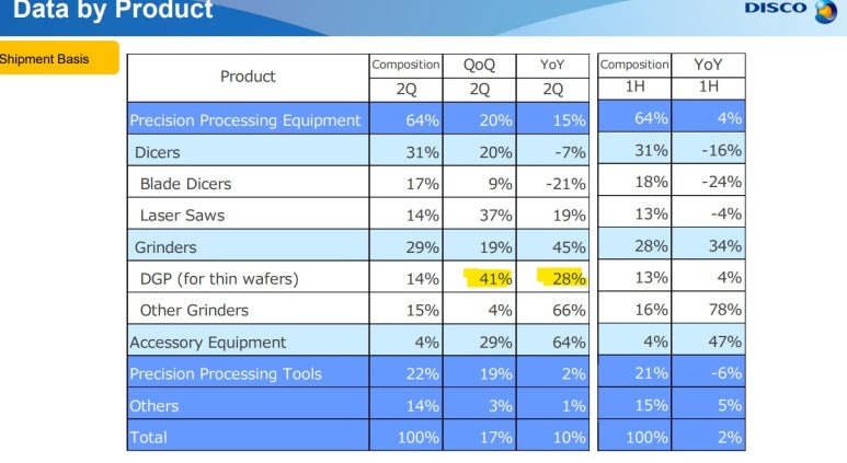 정확하게 페어링 되는 개념은 아니지만, 시장 리더 DISCO의 얇은 웨이퍼 용 그라인더는 QOQ로 40% 성장했다. (2022년 4분기 QoQ 60% 성장, 2023년 1분기 QoQ -23% 성장, 2023년 2분기 QoQ 41% 성장, 2023년 3분기 10% 성장 전망, 회계연도 기준이라 한국보다 2개 분기가 느림)
